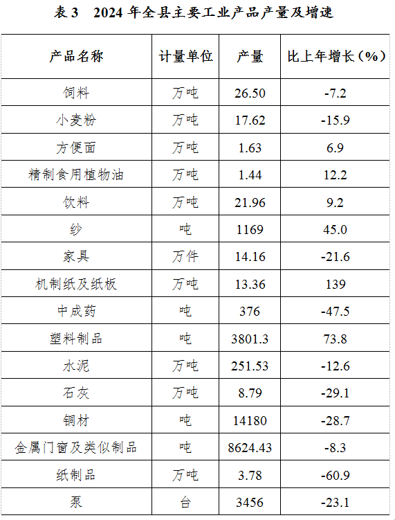 全年全部工业增加值同比增长8.9%,占生产总值的比重为23.9%。其中,全县规模以上工业企业(年主营业务收入2000万元及以上的工业法人企业)工业总产值同比增长11.2%;规上工业增加值同比增长12.7%。从三大门类看,采矿业增加值同比下降20.3%;制造业增长13.7%;电力、热力、燃气及水生产和供应业下降3.6%。