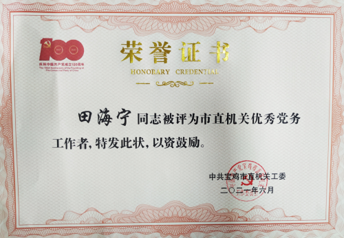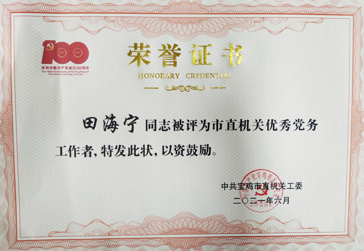 6月29日,中共宝鸡市直机关工委召开“两优一先”表彰大会。我局退休党员李海珠、王速慎荣获“光荣在党五十年”荣誉勋章。中共太阳城娱乐机关第一党支部被市直机关工委表彰为先进基层党组织,田海宁同志被表彰为优秀党务工作者,李红同志被市直机关工委表彰为优秀共产党员。