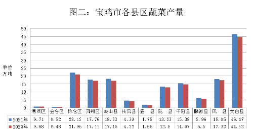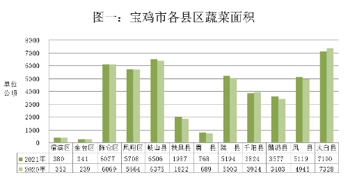 大湾区“菜篮子”基地建成供菜。今年以来,我市以蔬菜产品质量安全为基础,瞄准粤港澳大湾区等精细化蔬菜市场,在太白、眉县、陇县实施大湾区“菜篮子”基地建设工程。截至年底,已获得认证的太白绿蕾供港澳蔬菜基地已向粤港澳地区供应蔬菜3500吨,产值1400万元。高山冷凉蔬菜基地已具规模。持续开展在太白、凤县、麟游等县区打造全省高山冷凉蔬菜基地,种植面积不断扩大,产量持续增长。2021年,全市高山冷凉菜种植面积24331公顷,比上年增长0.9%,产量97.33万吨,比上年增长4.5%。