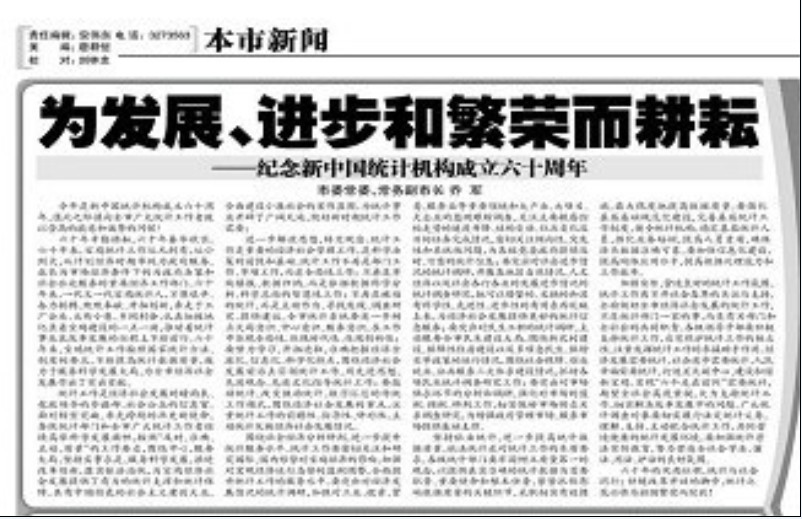 8月22日,《宝鸡日报》第三版全文刊载市委常委、常务副市长乔军为纪念新中国统计机构成立六十周年撰写的《为发展、进步和繁荣而耕耘》的署名文章。