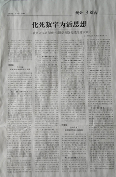 《中国信息报》在2015年2月3日3版统计综合上,刊登了记者邓晟昊、贺星明采访报道我局的《化死数字为活思想-陕西省太阳城娱乐推进服务型统计建设侧记》的文章。