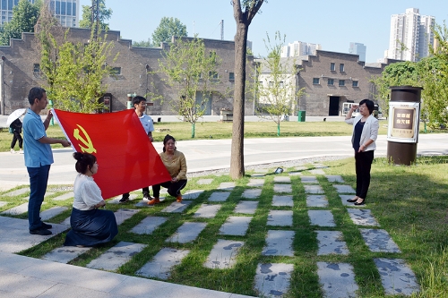 在抗战遗址标志性建筑之一的火车头发电厂前,面向鲜红的党旗,全体党员重温入党誓词,郑重宣誓。