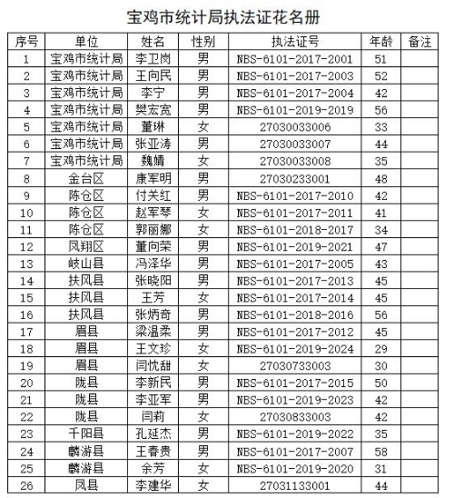 2017年以来,宝鸡市积极组建市级统计执法人才库,该库以全市统计系统通过国家统计局执法考试的持证人员为主组成,把建设一专多能、复合型、应用型的统计队伍为目标,定期进行统计法律法规、统计业务知识学习教育,不断提高执法人员的业务素质和执法水平,并及时将政治、作风、纪律、业务、责任过硬的统计骨干力量及时补充到统计执法人才库中。请看下表:
